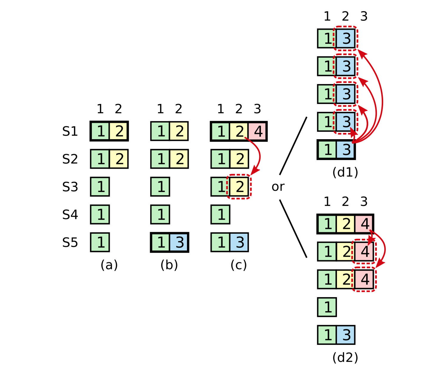 - (c) 还是将 index=2 & term=2 复制到大多数, 由于 currentTerm = 4,所以不能提交这条日志 。如果 S1 将 term = 4 的日志复制到多数派,那么 Leader 就可以提交日志,index=2 & term=2 也会间接一起提交,其实这就是 (e) 的情况,1-2-4 都被提交。