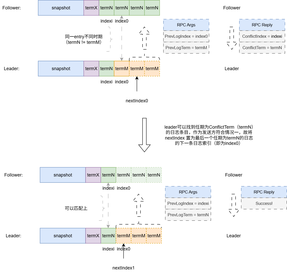 图示当中,leader节点准备发送位置为nextIndex以及后面的所有时期为 termM 的日志。但是Follower发现index0处的日志出现不匹配,于是根据上方 AppendEntries RPC的接收方 规则二,返回冲突索引 ConflictIndex = indexi、冲突时期 ConflictTerm = termN 。对于 AppendEntries RPC的发送方 来说显然我们的图示是符合规则一的。那么在什么情况下,raft会出现这种局面呢?我的理解是:图示当中Follower相对于Leader来说处在旧的时期(termN),也即Follower的旧Leader突然宕机了,并且indexi之后的时期为termN的日志并未复制到大多数节点上, 而图示当中Follower是作为少数复制了多数termN时期未被提交日志的节点,图示Leader在旧时期(termN)作为Follower没有复制太多termN时期的日志的节点 。注意这里存在很关键的大小关系: termM > termN 并且 在第二轮日志复制的请求当中indexi < nextIndex1 。综上,作为 AppendEntries RPC的发送方 我们可以大胆基于规则二去利用conflictTerm加速日志的回退!