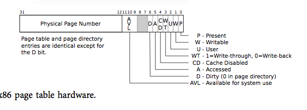 entry的低12位是一些控制位,比如0位指示该entry所指向的物理地址是否有效,第1位指示entry所指的物理页是否可写,第3位代表用户态能否访问,等等。我们可以利用这些位来实现很多unix-like中的骚操作,最有名的应该是利用第1位实现写时拷贝。
