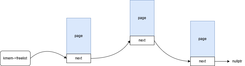 回到kinit1函数,kinit1函数执行第一个阶段的内核内存管理的初始化。它会把从内核代码结束的位置开始往上4M的位置为止,以page为单位将每一页利用链表串起来。这部分涉及代码非常简单,直接看源码会比较清晰,这里就不贴它的代码了。大概的结构图如下: