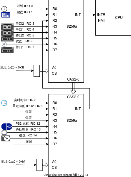 从图中可以看到有两个8259a,上面那个8259a是主PIC,它的INT引脚直接接到CPU上;下面那个8259a的INT引脚接到主PIC的IR2引脚,所以它是从PIC。 每一个PIC的引脚会接一个外设,(如果对应的引脚没被屏蔽的话)外设会通过PIC间接向CPU发中断。