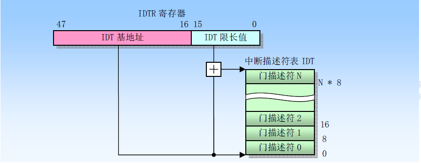 高32位存放中断描述符表的基地址,低16位存放中断描述符表的大小(字节为单位)。