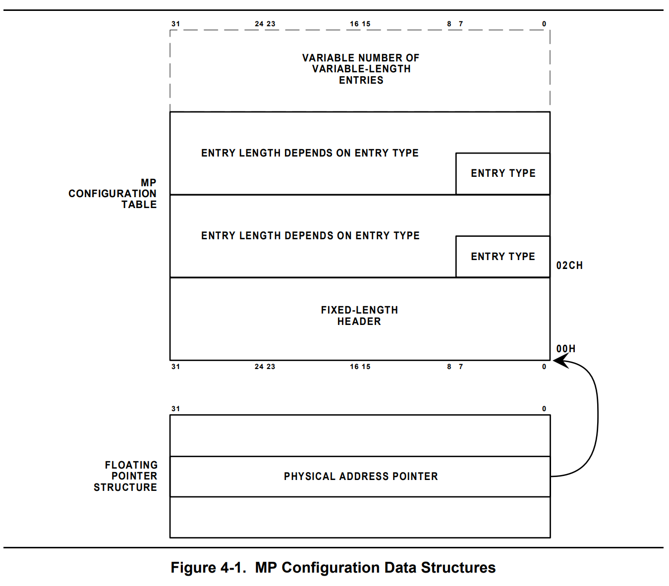MP Configuration Data Structures整体框架如下图,图解了MP floating pointer structure、MP Configuration Table Header、Table Entries三者之间的一个关系,先了解一下大致的框架,接下来我门逐一剖析。