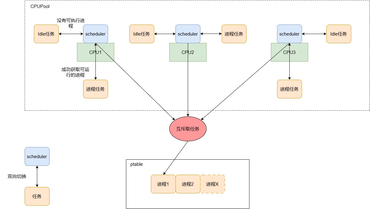 其实CPU Pool和线程池非常像,XV6的每个CPU都互斥到ptable中去取进程,然后去消化进程。唯一的区别就是CPU要和很多寄存器、硬件打交道,但是最终整体的框架思想都是一同百通,
