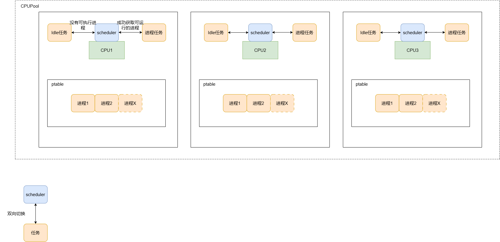 这里我可以用一张类似sylar的协程调度器模型来总结XV6进程调度模型: