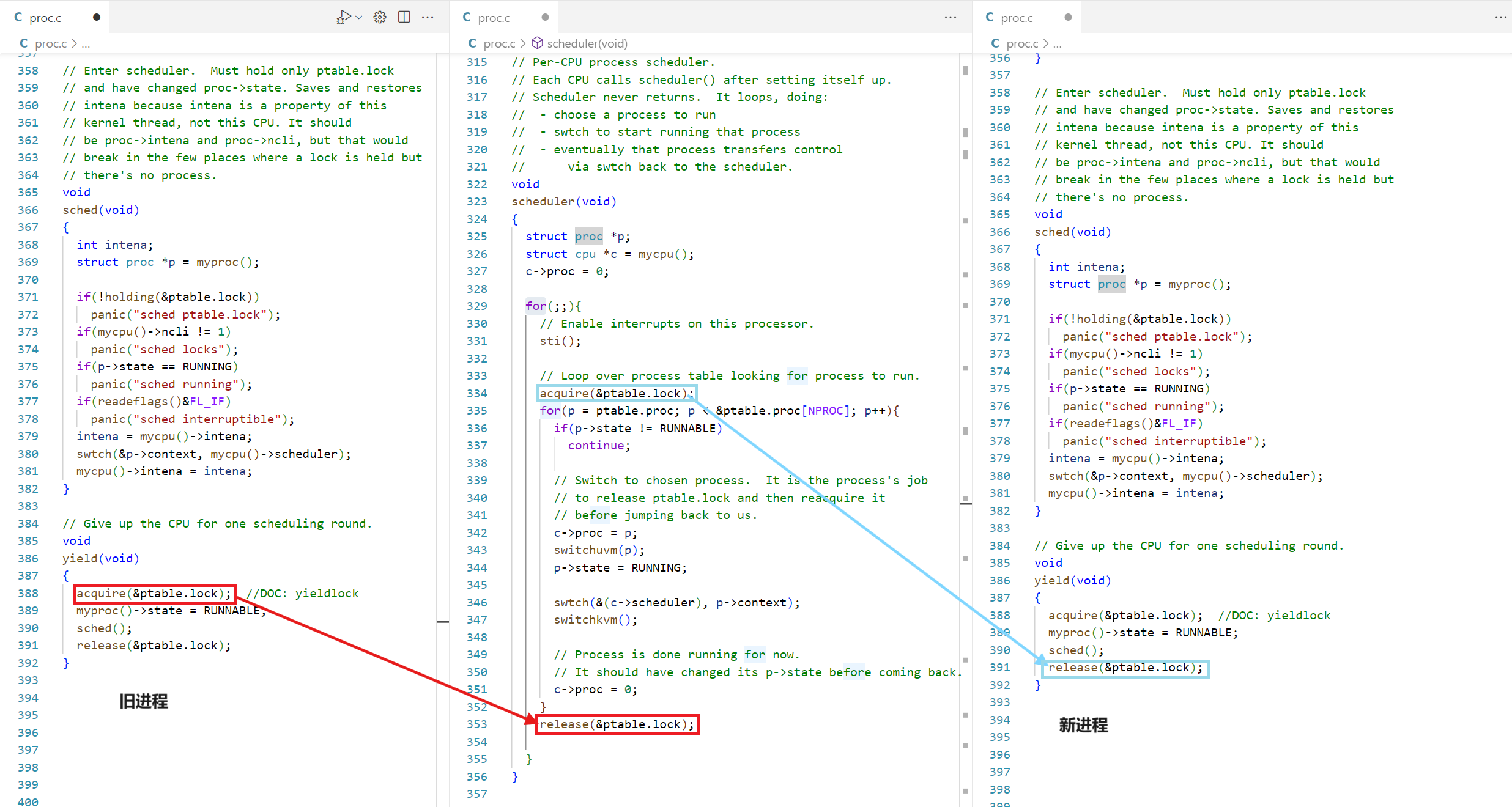 一张图片概括yield、scheduler的加锁关系。如下图,进程利用yield进入调度器时会获取ptable的自旋锁(自旋锁内部会关中断,并且将关中断之前的中断状态保存到intena中),在切换到scheduler后(可能)会由scheduler解锁。在从scheduler切换到下一个任务前,(可能)scheduler会获取ptable的自旋锁,在却换到下一个任务后,由任务进行解除ptable的自选锁,注意这里是可能,因为还有可能scheduler的内层循环还没有执行完,以至于内层循环还可以找到下一个待执行的日任务,此时ptable的锁,就是:老进程加锁,新进程解锁:
