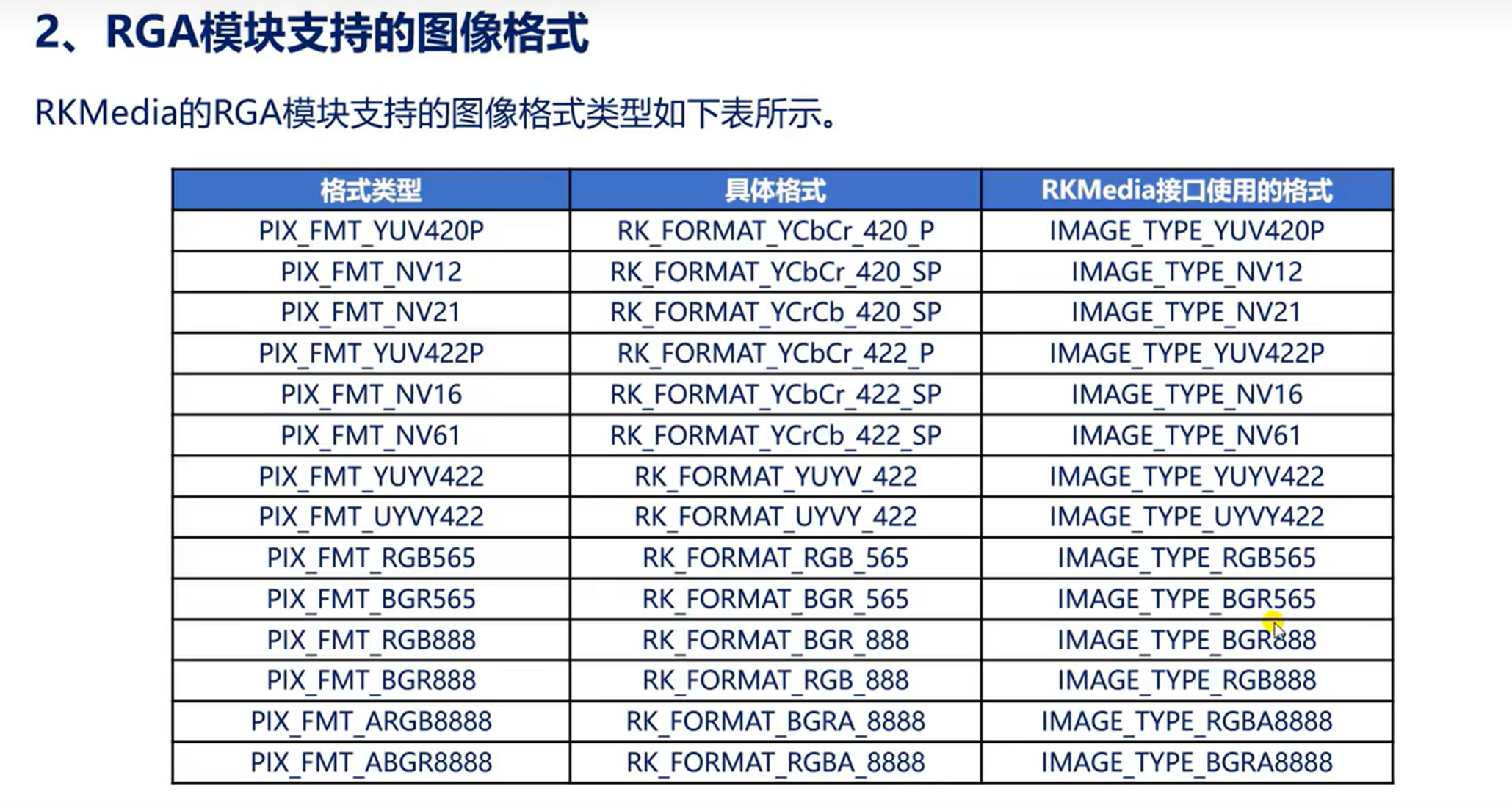 RGA模块对图像格式的支持也是有限的,参考如下: