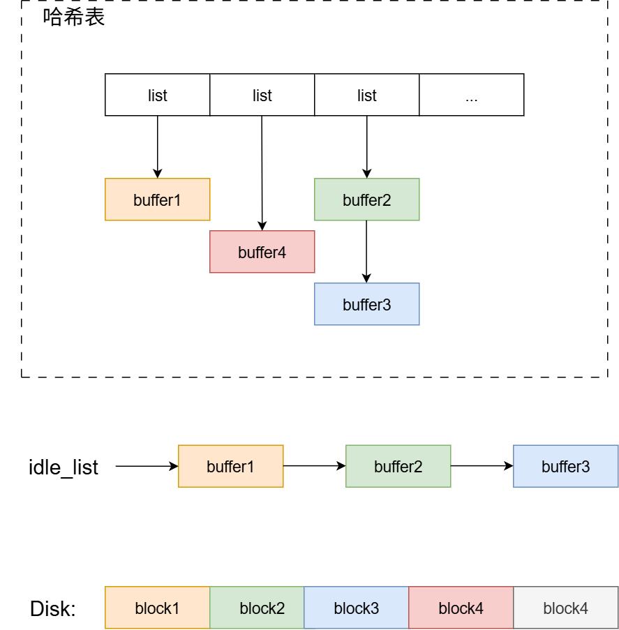 ):- 基于idle_list执行LRU替换策略。从idle_list可以了解到,idle_list的最后一个元素即为我们需要的 最久未被访问过的缓存块。也就是本节最开始所放图片当中的buffer3。