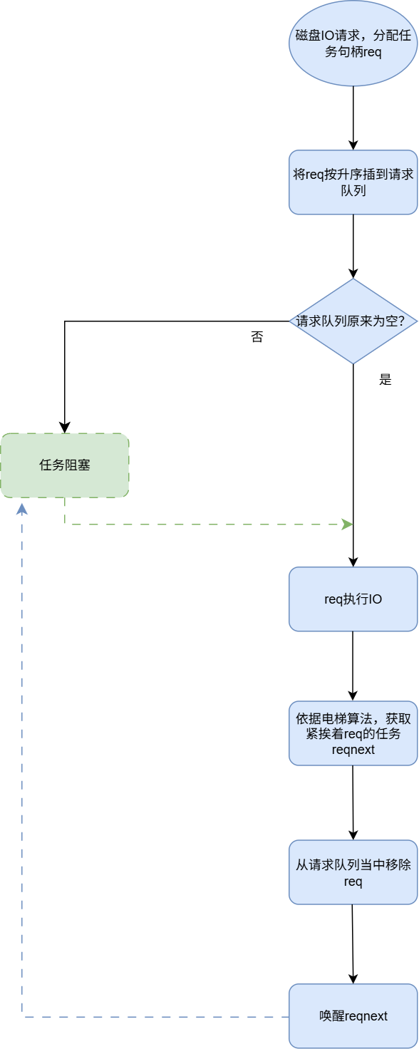 - 如果在该任务插入到队列前,队列非空,就当前阻塞进程。说明已经有进程在执行IO任务。