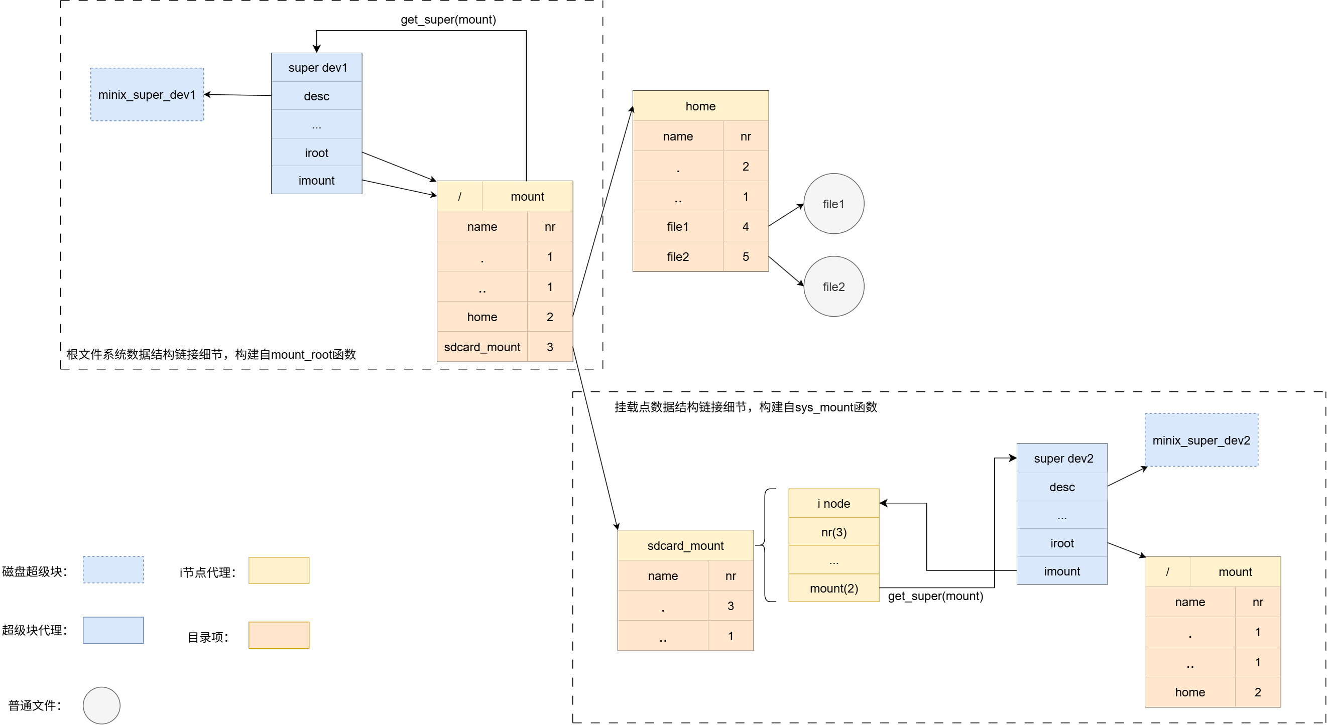 。这里需要注意的是,sd卡所有的文件系统 和 我们的根目录所挂载的文件系统一定是两个独立的互不相干的两个文件系统,他们各自拥有自己独立、自包含的i节点编号空间。在同一个Linux系统下,SD卡上文件的i节点号与根文件系统下文件的i节点号即使数字相同,也绝对不会发生冲突。系统能够清晰地区分它们。 onix sys_mount函数实现伪代码如下: