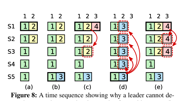 这里主要通过 (c) 和 (d) 来说明问题所在。其实这张图用 Raft 大论文的图会比较好理解。(d) 和 (e) 分别对应 term=4 有没有复制到多数派的情况。