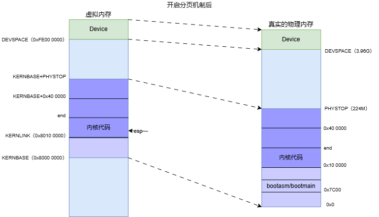 首先明确,到目前为止cpu使用的entrypgdir是4M big page的页表。kvmalloc会构造一个页表kpgdir,该页表会使用4K的页,分页粒度更加细粒,相对于entrypgdir来说做了进一步细分。kpgdir的内核映射的地址是没有任何变化的,切换到kpgdir页表后,内核的地址空间和之前没有什么区别。唯一的区别就是kpgdir的地址映射范围更大,多了一些entrypgdir页表所不可访问的范围。从数组kmap可以看到,pgdir将原来4M的内核空间扩张到了PHYSTOP(224M),同时将物理内存的高位的设备空间直接映射到内核高位虚拟地址空间。XV6在启动阶段没有进行内存探测,只是暴力的将可分配物理内存规定为PHYSTOP(224M)大小,我们可以通过修改PHYSTOP来动态调整XV6的物理内存上限。但是由于PHYSTOP被映射到了KERNBASE之上,所以PHYSTOP的大小是有限制的,即使物理内存是4G,KERNBASE + PHYSTOP的大小也不能覆盖设备地址空间。