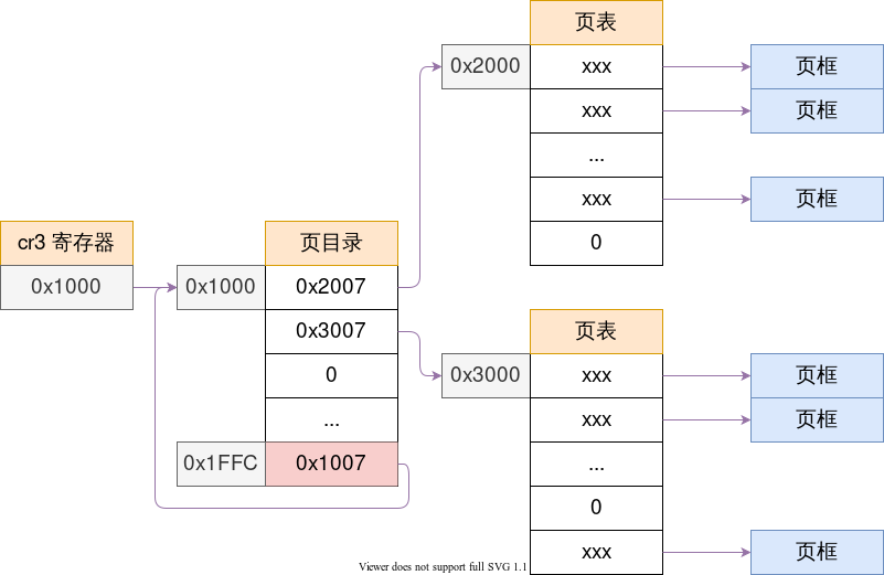 从图中我们可以看到,页目录的最后一个entry指向了页目录本身。(0x1007中低12位是控制位!