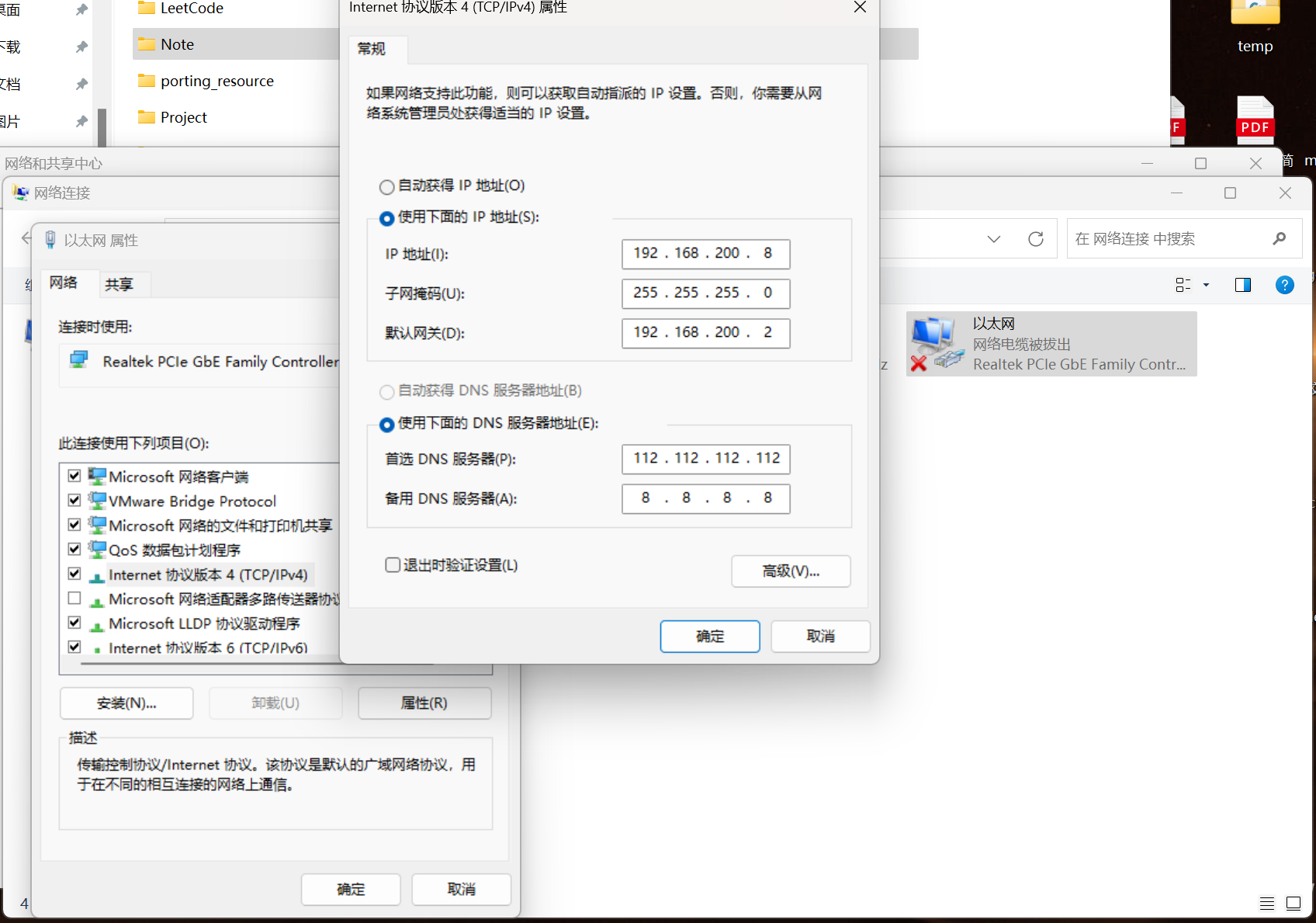 至此uboot网络烧写介绍完毕!如果你希望宿主机可以利用vscode的remote插件连接上桥接在以太网卡的虚拟机,可以把宿主机的以太网卡手动配置一个静态ip,注意,ip的网络地址、子网掩码、网关地址一定要和虚拟机保持一致!如下: