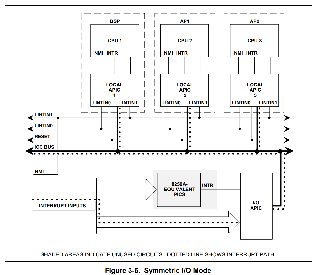 每个lapic都有一个唯一的ID,cpu可以在特定的内存(device space)上来查询自己所对应的lapic的ID号,lapic的ID其实也唯一标识了一个cpu。lapic会根据自己的ID从ICC Bus上接收属于自己的中断”报文“,然后经过一系列检查最后将中断发给cpu,当cpu处理完中断后,会反馈给自己的lapic,lapic收到cpu的回复后,同样将中断处理完毕的消息通知给ioapic,这点和单核架构中,cpu处理完中断后向master pic发送PIC_EOI是一样的道理。