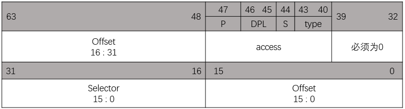 因为中断不止一个,所以,和全局描述符类表似,中断表也是通过一个大的数组来记录每一个中断的属性。数组中每一个Entry格式如下图,每一个Entry同样是8个字节:
