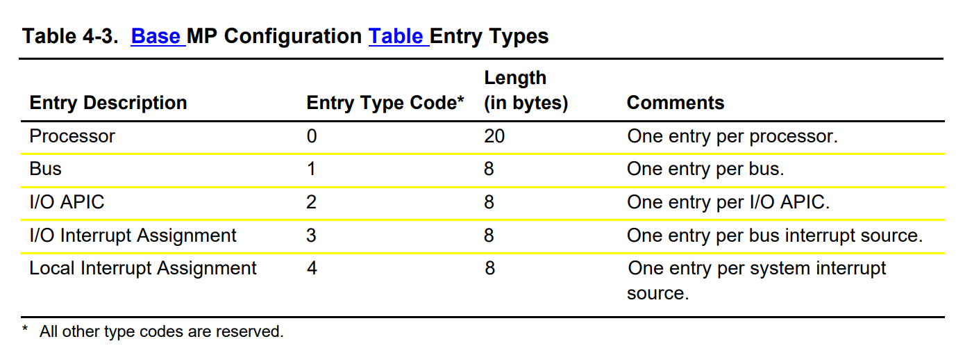MP Configuration Table Header后面会跟上各自类型的Base MP Configuration Table Entries,每个Entry的第一个字节会标明其类型,并且每种Entry的长度都各自固定,所以我们可以通过一个循环来遍历每个Entry,一共有5种类型的Entry,如下图: