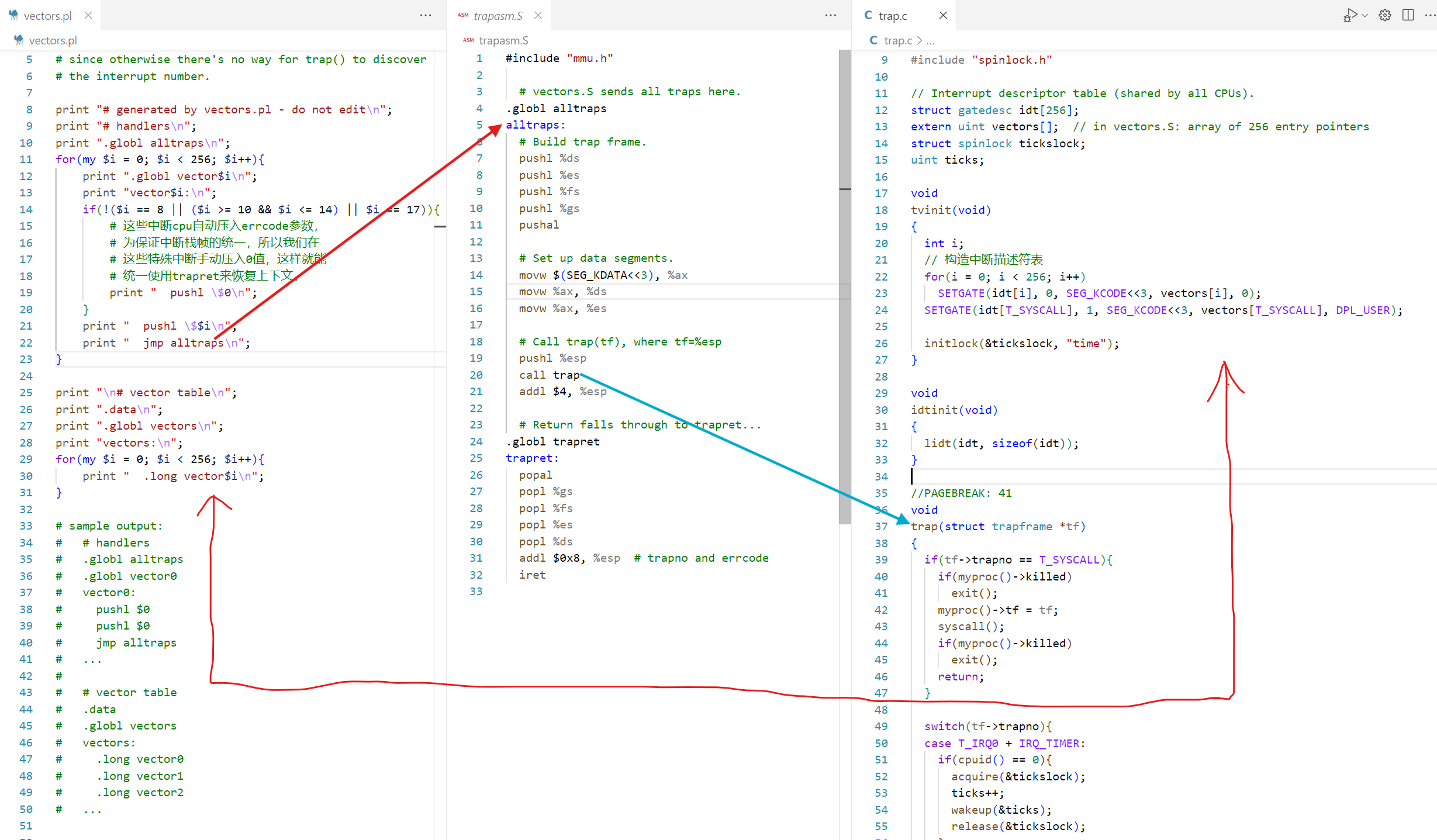 从pl代码上我们可以看到,就是利用for循环构造vectors数组,该数组专门存放中断处理函数。我们先来分析一下它如何构造vectors的,首先最上面有一个for循环,for循环中使用了一个if判断,因为有些中断cpu不会自动压入错误码,所以我们需要手动压入一个占位值,方便trapret的处理。在for循环下面最后压入了一个jmp指令,所以pl生成的汇编并不是中断处理函数最终代码,pl生成的中断处理函数会跳到alltraps,alltraps代码我们下面再进行分析。pl在最后生成的汇编代码定义了一个vectors数组,数组里面元素就是上面定义的256个vectori(i=1、2、…)。