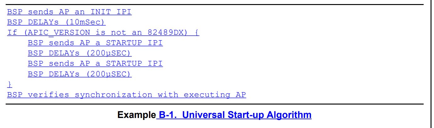 这里对多核处理器的启动流程做一个简单总结:我们可以理解为,多核CPU中,有一个CPU被设计成BSP,其他的CPU都被设计成AP。当然,在实际硬件设计上为了考虑容错性,任何一个CPU都能成为BSP核。 系统最开始,BSP有对硬件的绝对控制权,包括去控制其他AP的启动和停止。为了启动其他AP核,BSP首先通过三种可能的方式搜索MP floating pointer structure,如果找到了一个有效的MP floating pointer structure就去遍历MP configuration table查询处理器信息和ioapic的信息;如果无法找到一个有效MP floating pointer structure,那就认为系统只有一个CPU——BSP。在所有CPU启动后,BSP就退化成AP,系统不存在BSP、AP之分。 当然,我们需要要记录BSP CPU的lapic的ID(这个ID也唯一标识着CPU),这样我们才知道谁可以去其控制其他CPU的停止。在BSP启动其他AP前,因为AP CPU是暂停状态,所以其他AP无法执行OS代码,并且大部分中断都是被禁用,但是INIT or STARTUP interprocessor interrupts (IPIs)不会被屏蔽,当AP收到来自BSP的INIT or STARTUP中断,就会启动它自己。 AP在收到BSP的启动中断后,也会进入保护模式、有自己的独立的一套寄存器、设置自己的全局描述符、开启分页、有自己的堆栈等。