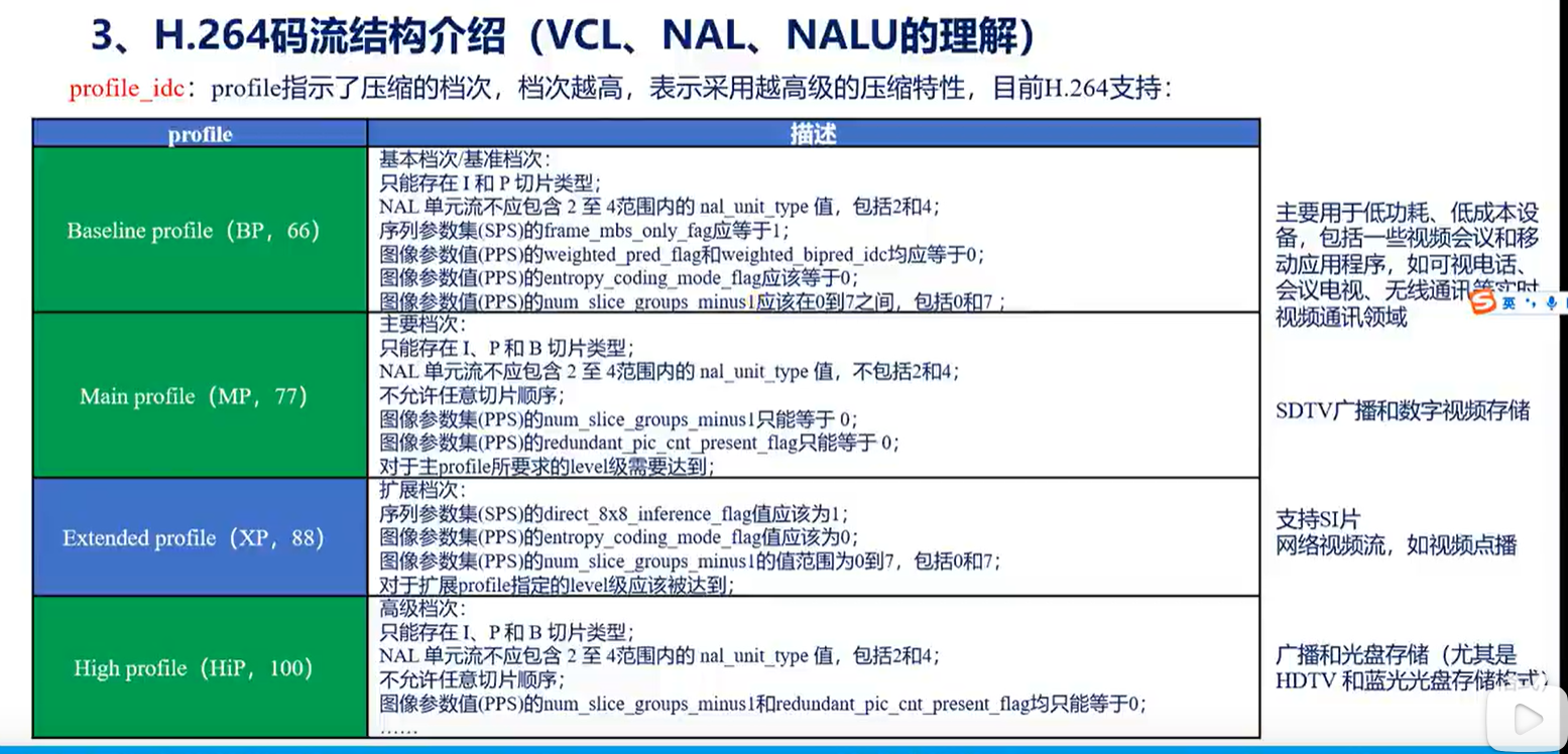 nalu的类型为sps(Sequence Paramater Set)的profile表示码流压缩档次(100)