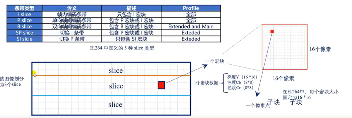 slice:I条带、P条带、B条带。为支持不同编码流之间的切换,还定义了SI条带、SP条带。