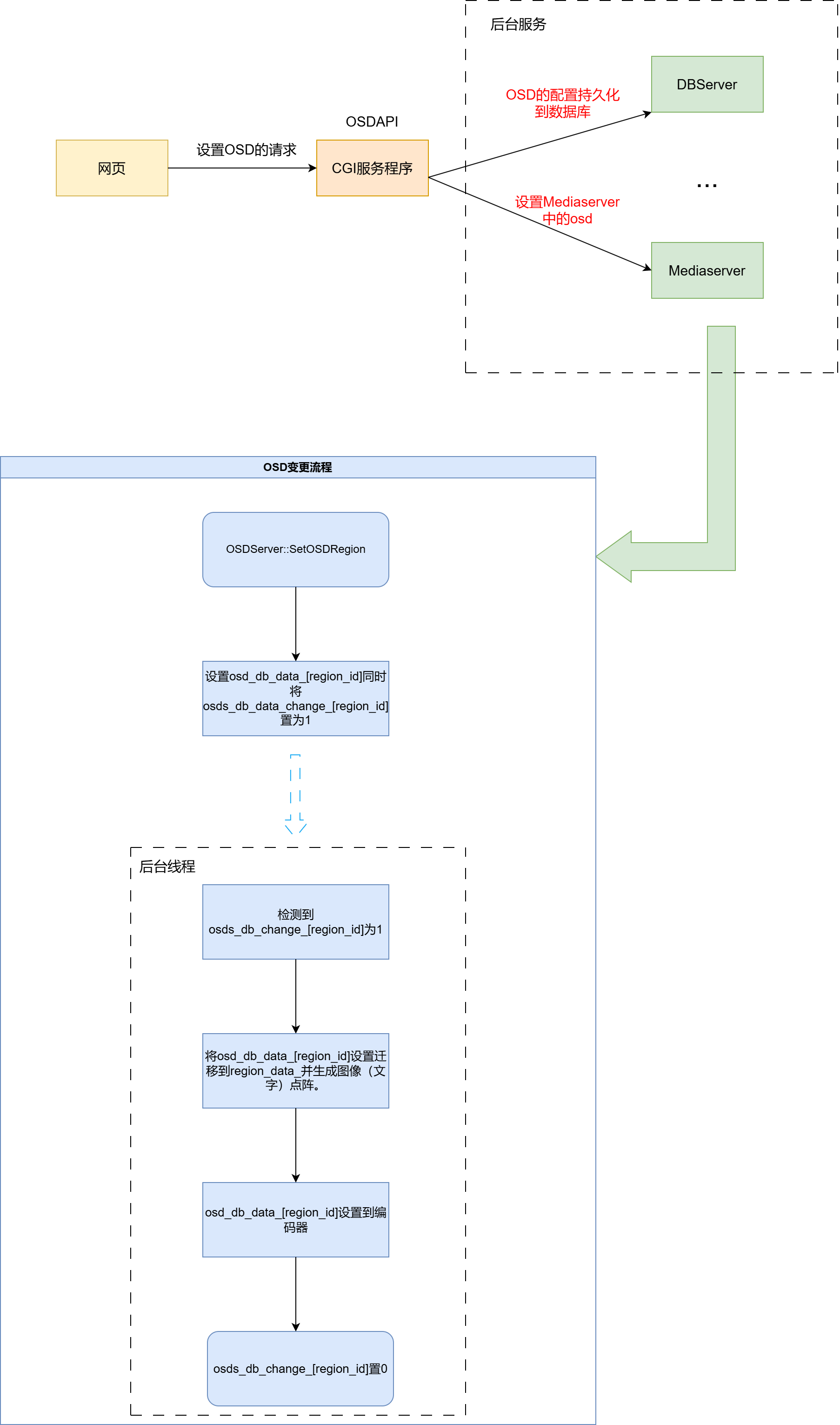查询数据库对osd的配置,并设置到osds_db_data_数组设置osds_db_data_change_相应元素为1,使后台线程能察觉到osd配置的改变,并同步给编码器。