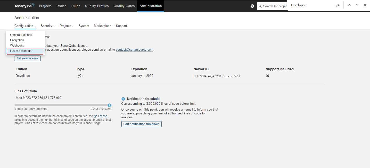 重启sonarqube容器,然后License Manager当中填入上文获取的证书即可: