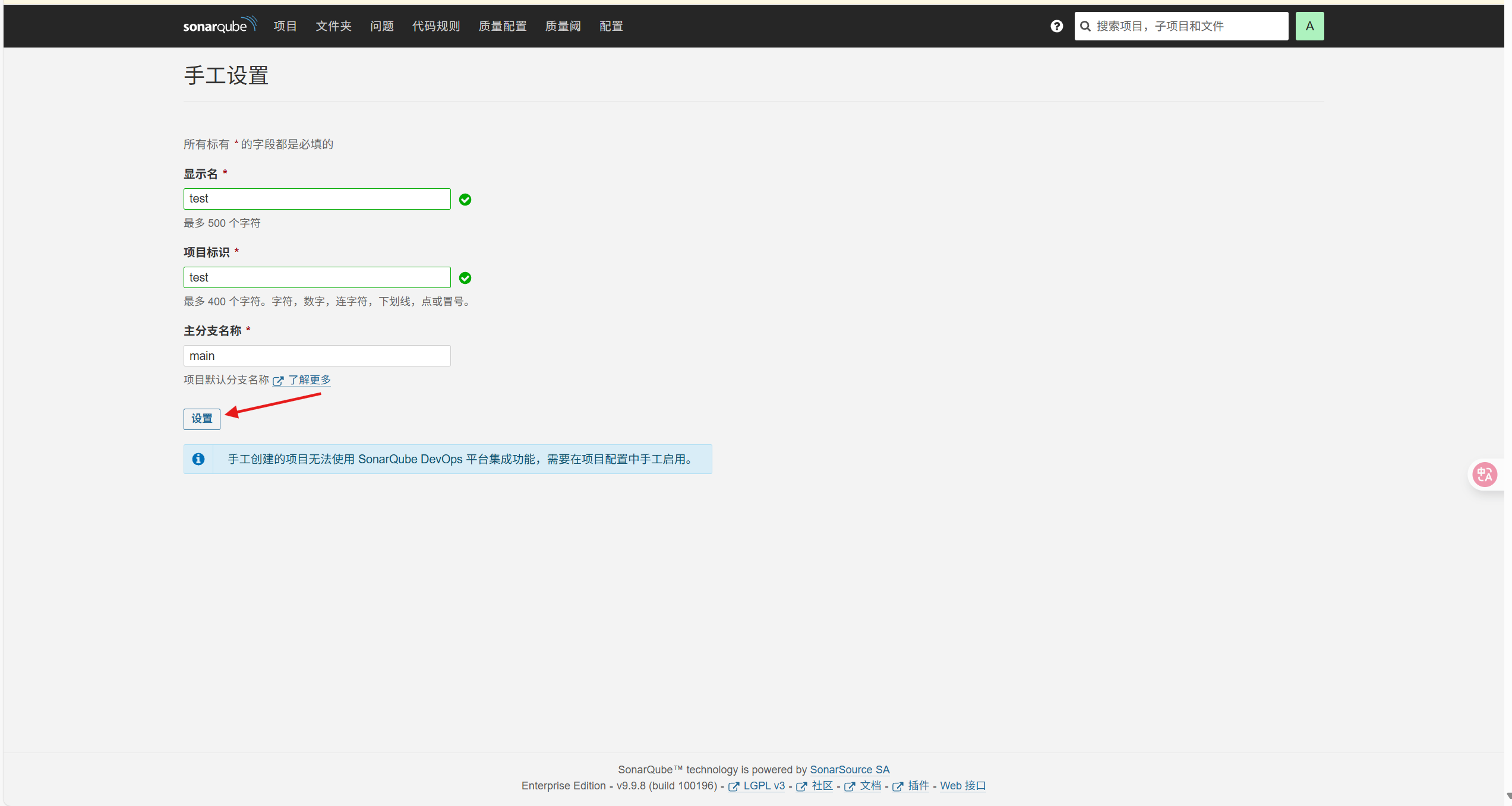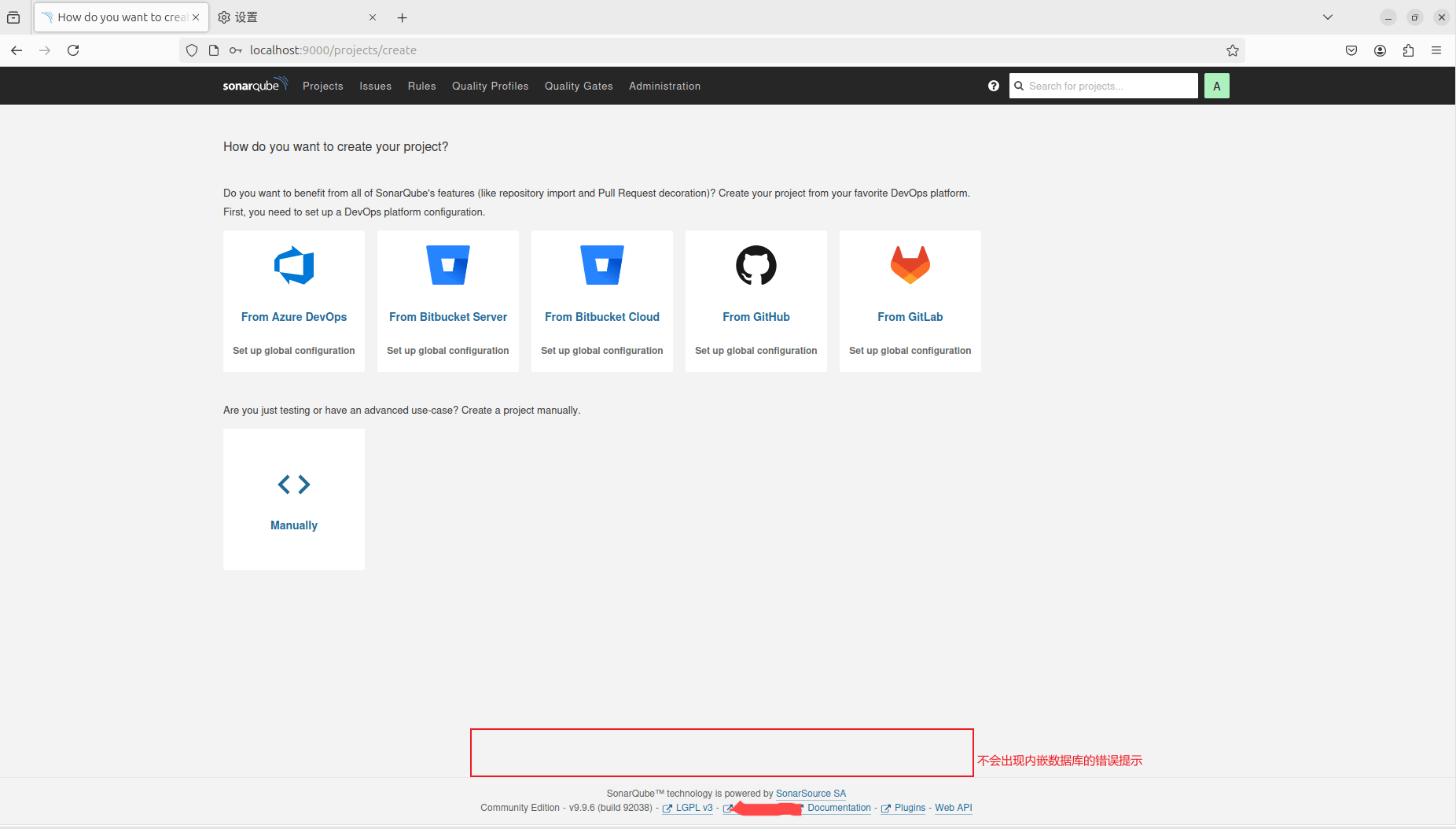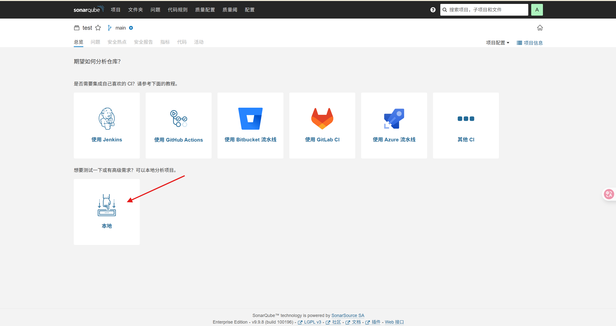 下载完成后,将插件拷贝到主机的/opt/sonarqube/extensions/plugins目录下(plugins目录需要手动创建),再次重启sonarqube容器,重新登录http://localhost:9000/,可以看到提示变成了中文,说明我们的插件安装成功了!