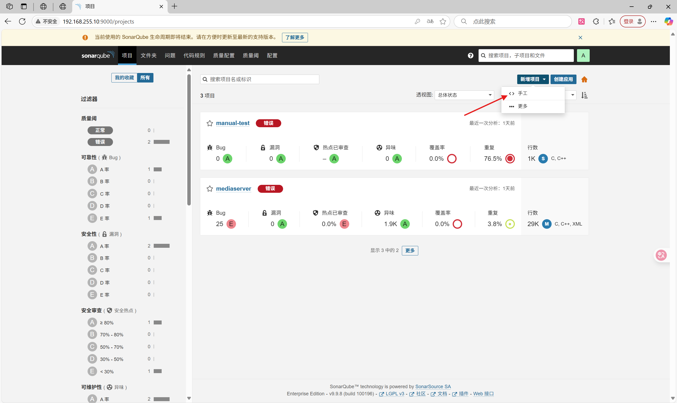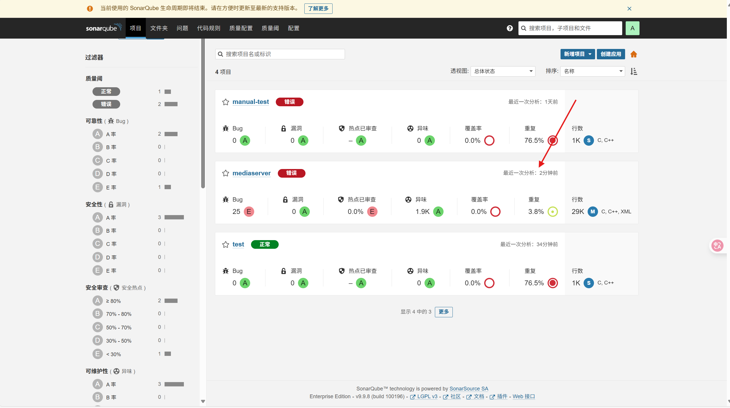 在sonarqube网页上可以看到分析结果: