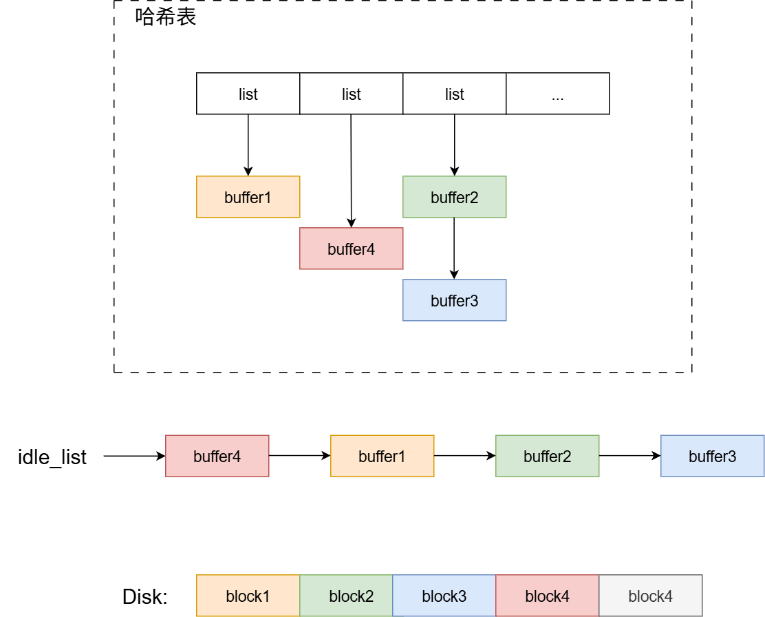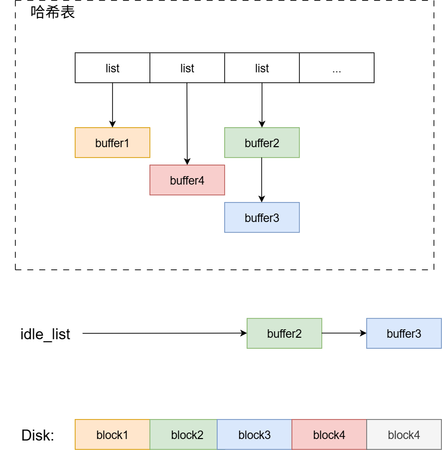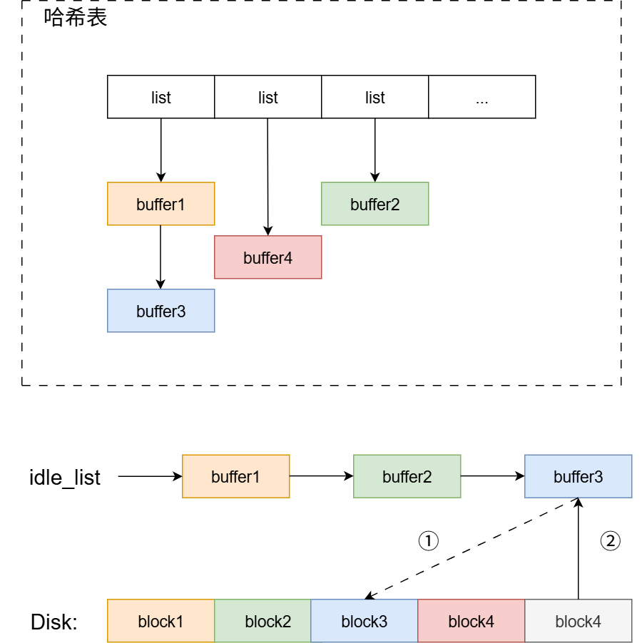 ):- 基于idle_list执行LRU替换策略。从idle_list可以了解到,idle_list的最后一个元素即为我们需要的 最久未被访问过的缓存块。也就是本节最开始所放图片当中的buffer3。