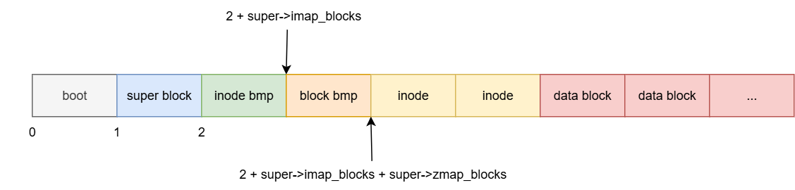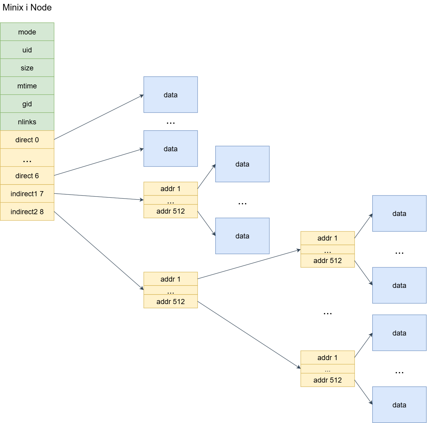 minix_inode_t::zone | 长度为9的uint16_t类型数组,前7个元素代表直接块,直接指向磁盘数据块,第8个元素为一级间接块,第9个元素为二级间接块 |